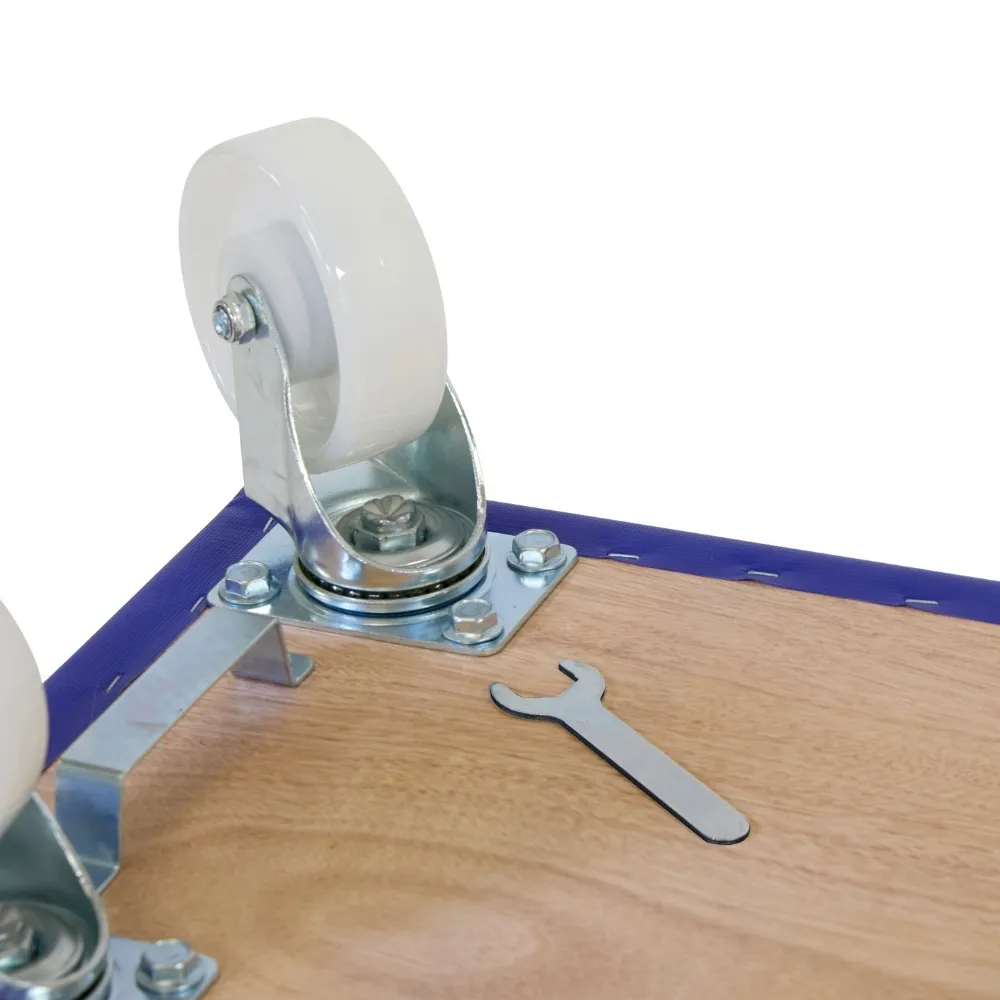 Rolka meblowa z odpornymi na zużycie nylonowymi kółkami, dwoma kółkami obrotowymi z hamulcem, 600 mm x 350 mm i nośnością 400 kg.