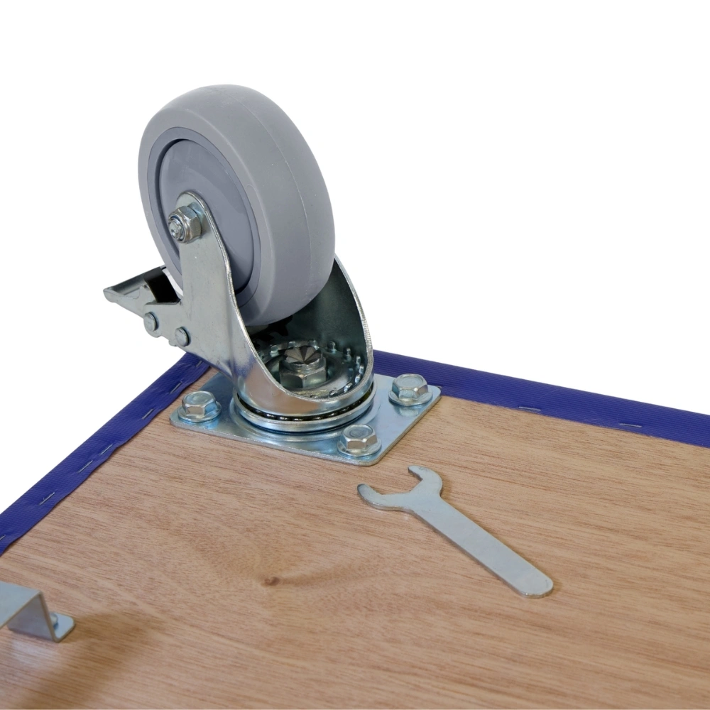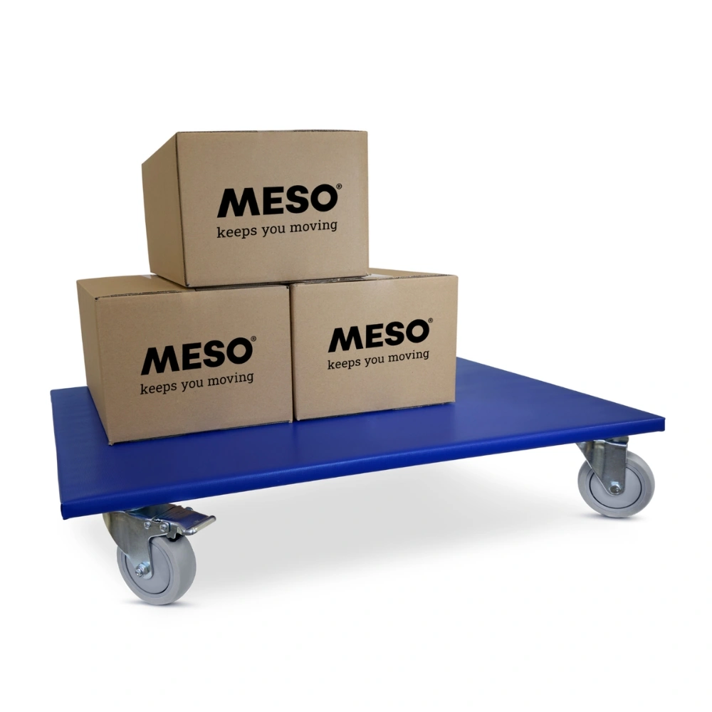 Rolka meblowa z gumowymi kołami antywibracyjnymi, dwoma kółkami skrętnymi z hamulcem, 800 mm x 400 mm i nośnością 350 kg.