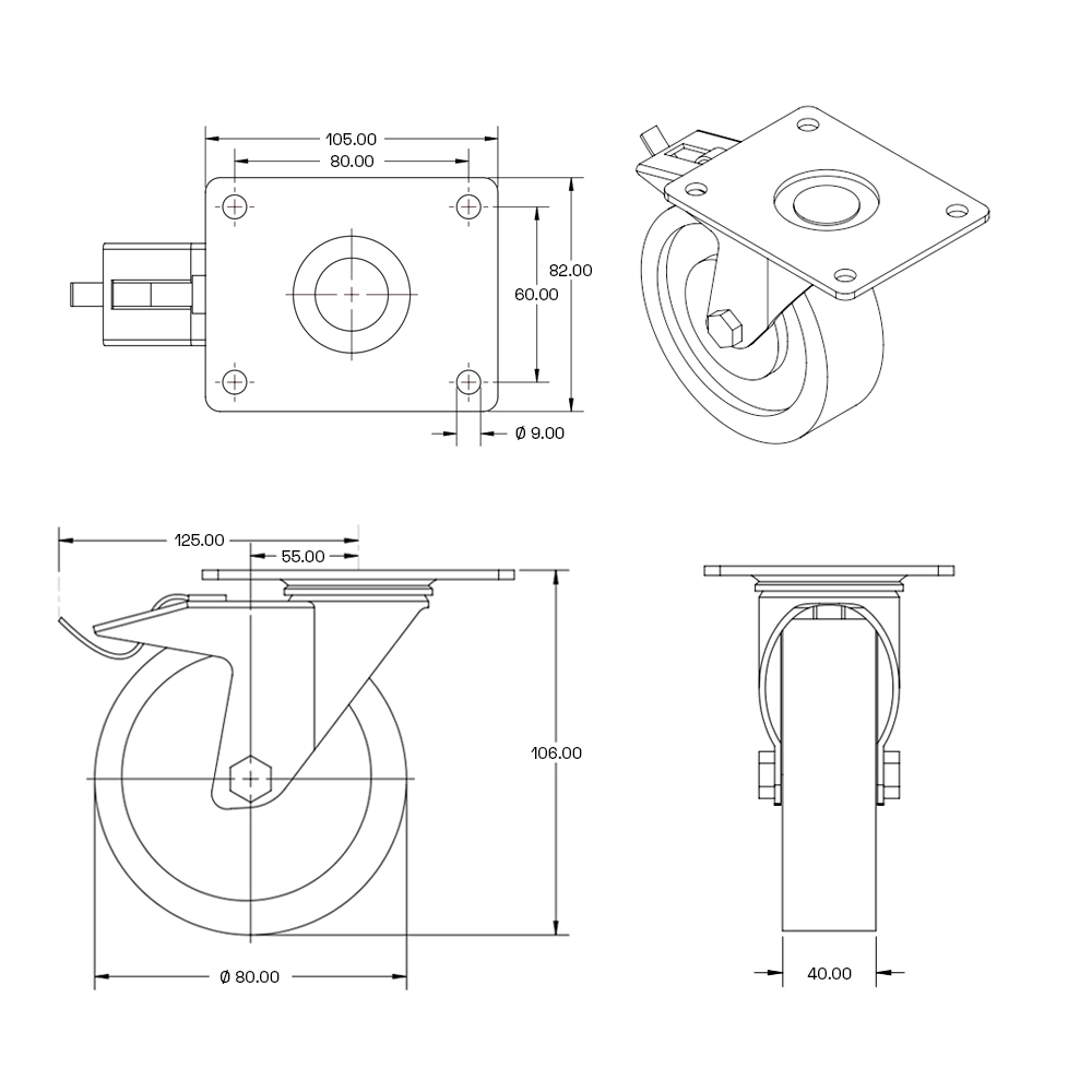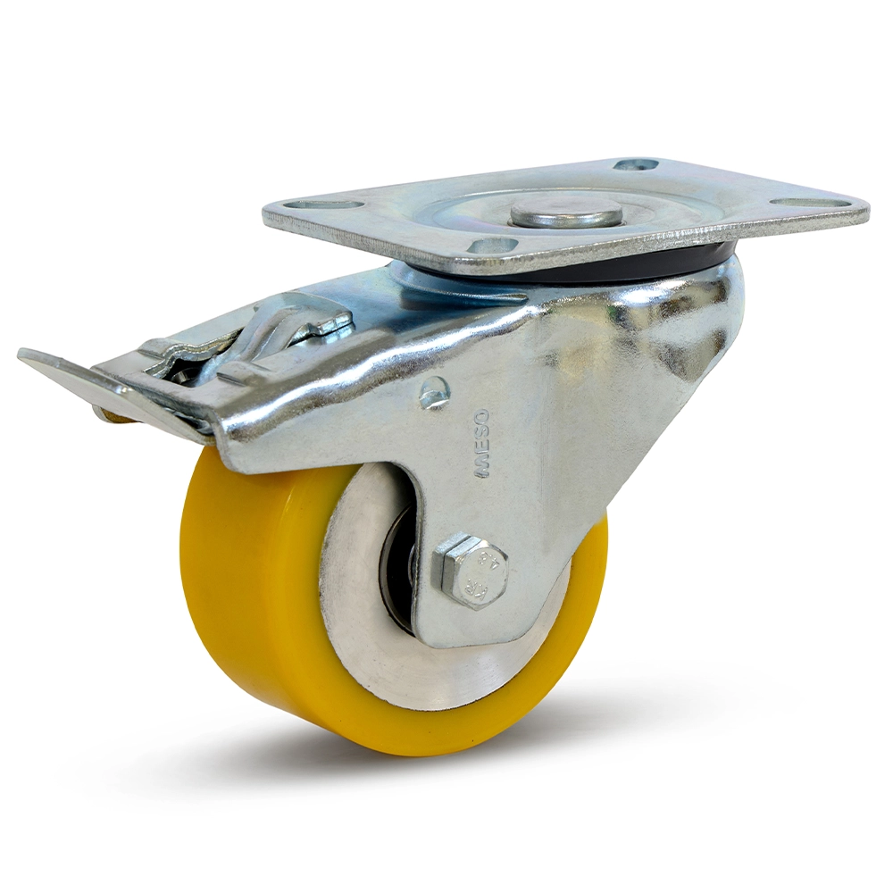Kółko skrętne PU do dużych obciążeń z hamulcem i płytą górną - 80 mm - 300 kg