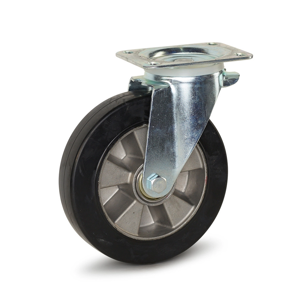 Koła do pojemników na odpady z czarnym gumowym kołem i aluminiowym korpusem.