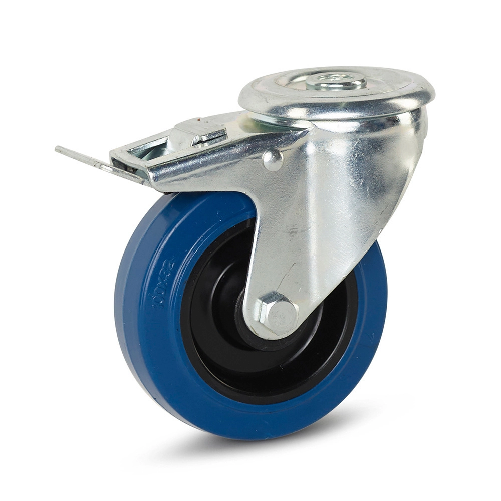Kółko obrotowe z niebieskiej elastycznej gumy z hamulcem i centralnym otworem - 100 mm - 130 kg