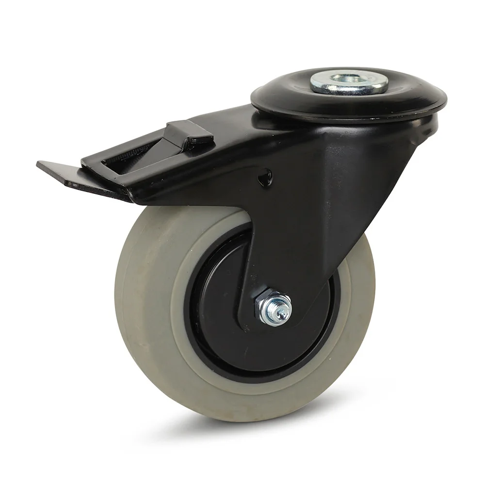 Kółko z szarej gumy w czarnej obudowie z hamulcem i centralnym otworem - 100 mm - 150 kg